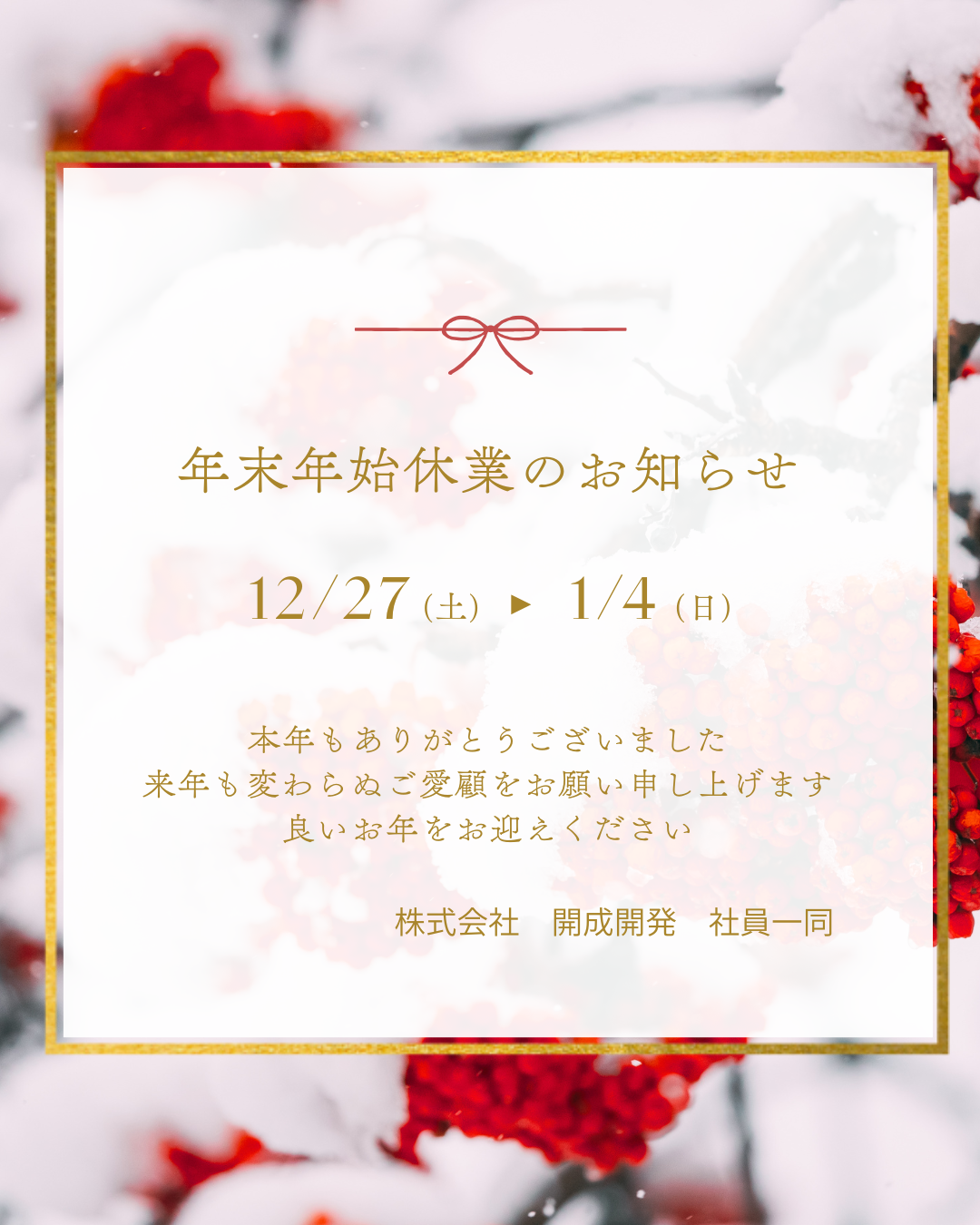 新年は1/5(月)より通常営業いたします。5日より内覧可能です。詳しくはお問い合わせください。