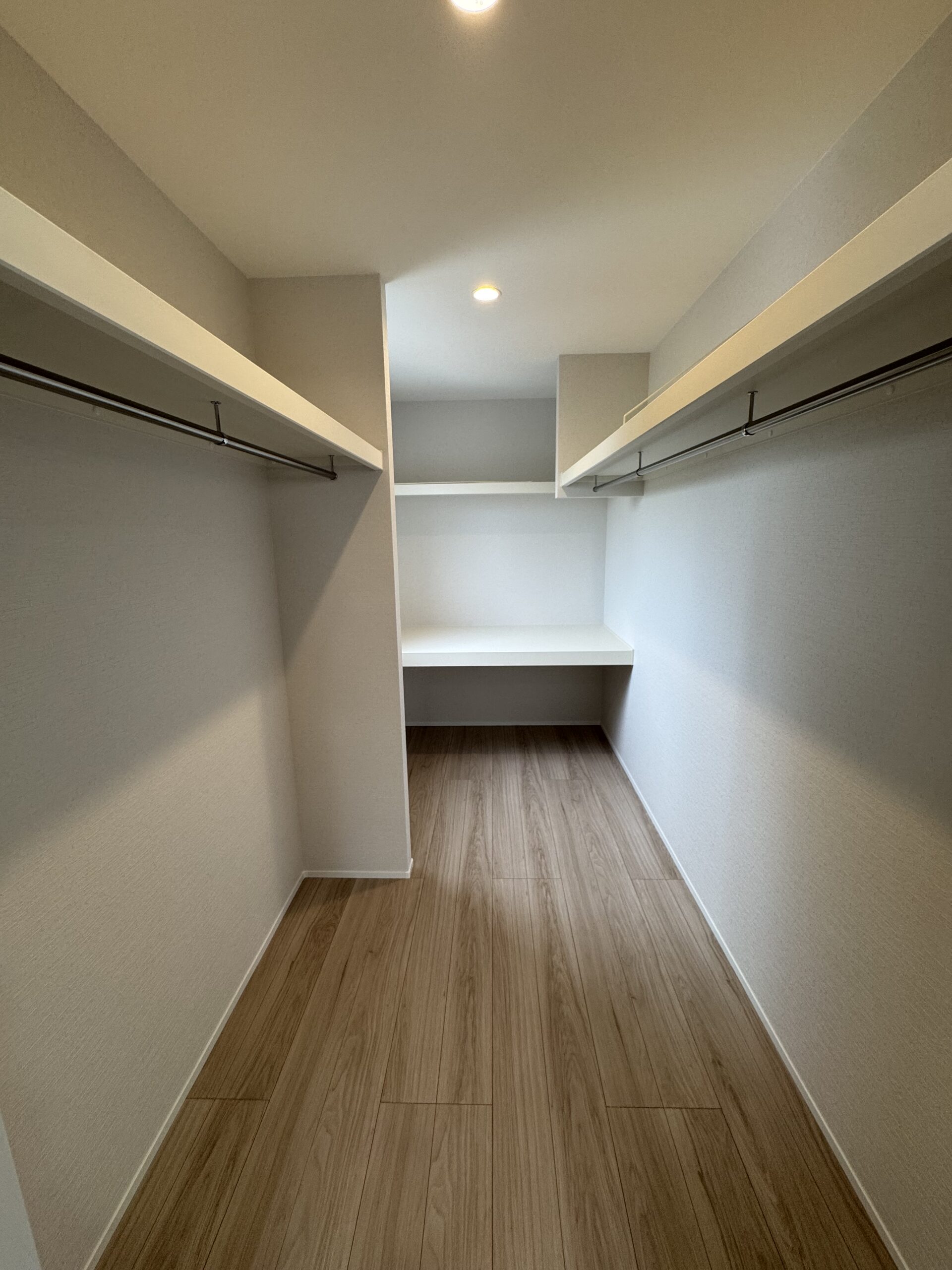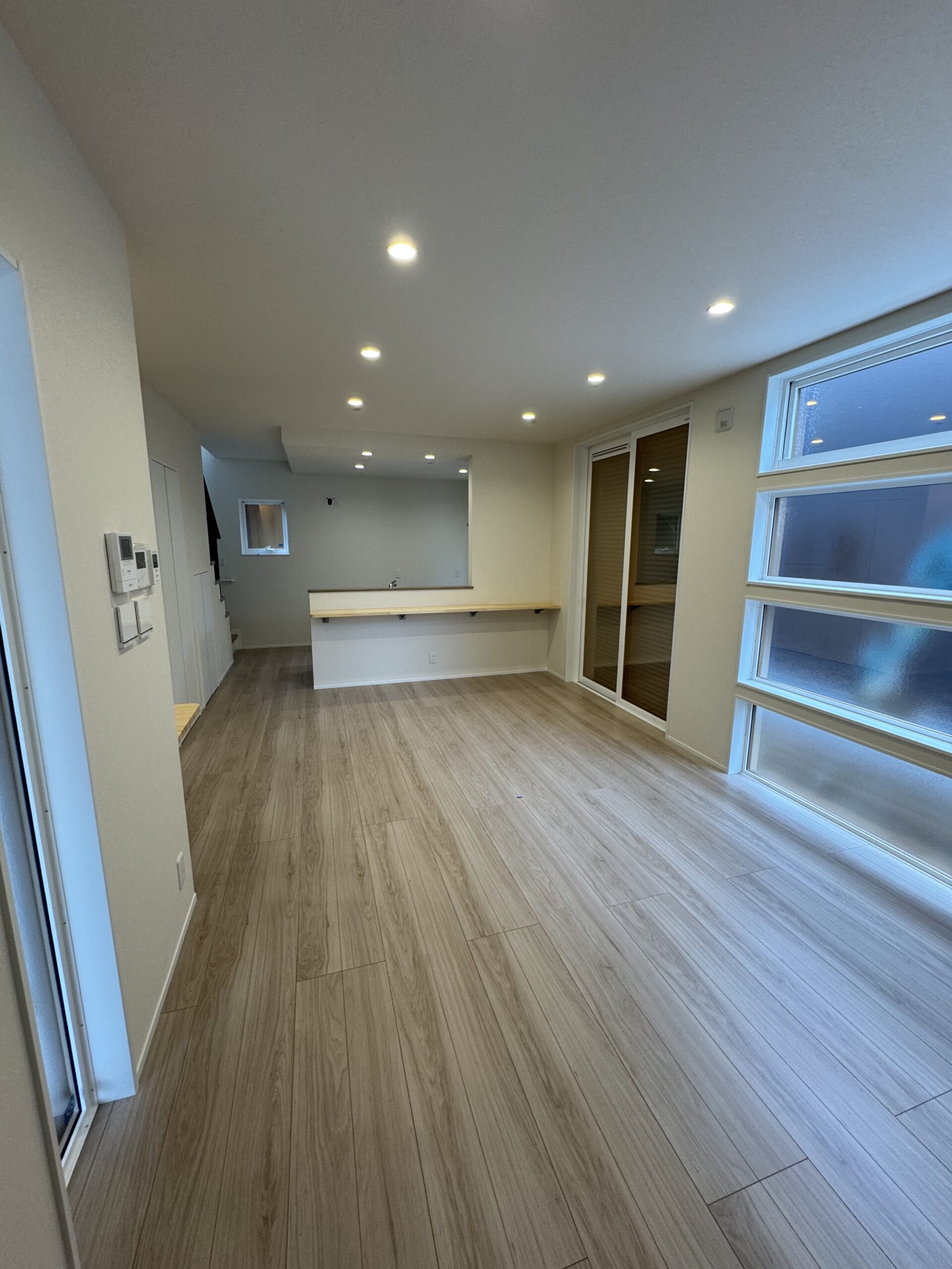 室内は直線美を活かしたシンプルな設計に、明るいフローリングと白い壁が開放感を演出。